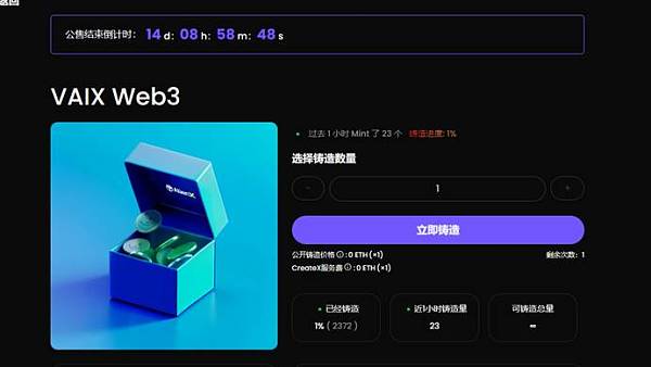 点右侧的 open available spellbox,花费大约0.3u的gas费,打开宝箱,即可完成任务,返回页面提交任务。最后完成任务后,可以claim $ALIENX代币到自己的钱包。8、免费铸造VAIX Web3 NFT另外alienswap还为用户额外提供了免费的NFT铸造,铸造在15天后结束,我们只需要支付少量gas费即可获得。进入铸造页面切换网络为Arbitrum,并进行登录,点立即铸造即可