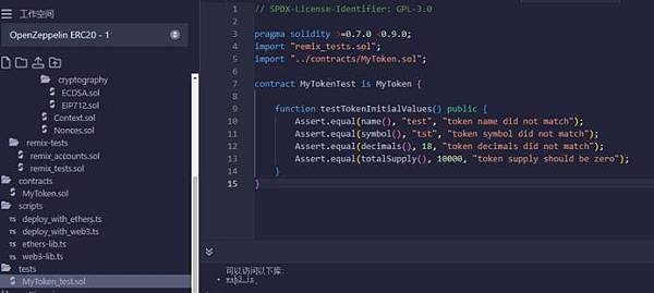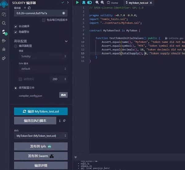 选择左侧的mytoken_tset.sol文件,修改代币名称、代码、精度以及总量