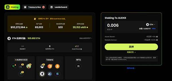 完成之后,返回任务页面,进行验证。4、完成质押打开质押页面,使用钱包登录。质押支持以太坊、Arbitrum、BTC以及Solana链,这里我们可以选择Arbitrum链,质押少量资产。目前ALIENX的treasure box活动中,质押不小于20u的资产,质押完成后顺便还可以获得treasure box并可以开出vAIX代币(质押页面点treasure box链接),后续也是箜杸的重要参考。