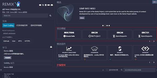 5、部署智能合约官方非常贴心的给出了部署合约的文档,这里主要有Foundry、Hardhat以及Remix这三种工具,这里我们选择Remix。打开Remix网页在右上角选择ZH中文接着导入智能合约代码,随便选择一个,比如OpenZeppelin的ERC20代码,左侧即可出现智能合约代码界面。