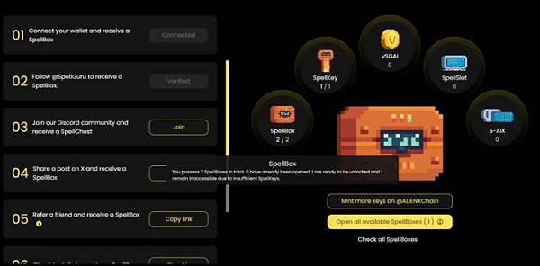 提交任务7、打开spellbox,领取宝箱打开网站切换网络为Arbitrum,连接钱包,完成左侧社交任务,即可看到右侧的宝箱数量