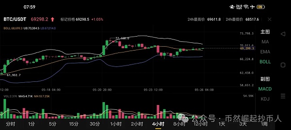 从比特币详细分析数据来看,比特币 btc 市价在 69200 点附近上涨趋势。4 小时行情图显示比特币价格在中轨附近呈震荡上涨趋势,根据附图所显示的绿色能量柱来看比特币处于明显上涨趋势,币价 MACD 以及 BOLL 持续回调,有继续持续上涨一波趋势。