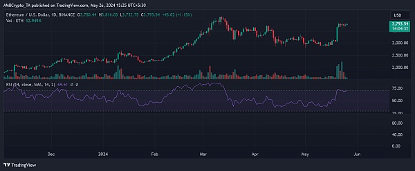 截至发稿时,以太坊交易价格约为 3,790 美元,涨幅超过 1%。每日时间框架图分析表明,自升至 3,700 美元以来,以太坊一直在努力维持该价格区间。