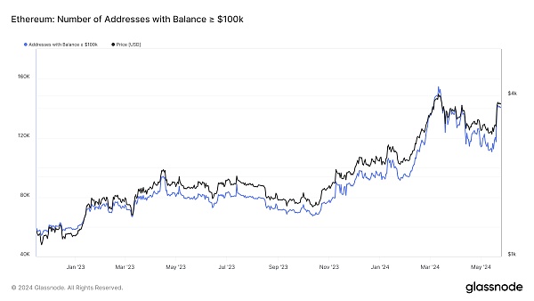 进一步检查发现,持有价值 10 万美元或以上的 ETH 的地址数量也明显增加。