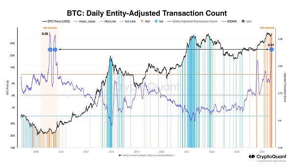 加密货币分析师Axel Adler在 X(以前的 Twitter)上的一篇文章中表示,需求非常旺盛。这一结论是基于实体调整后的交易数量得出的。