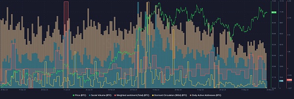 比特币背后的社交量自 3 月 11 日以来缓慢下滑。整个 5 月,加权情绪均为负值,自 5 月中旬以来出现两次正值激增。