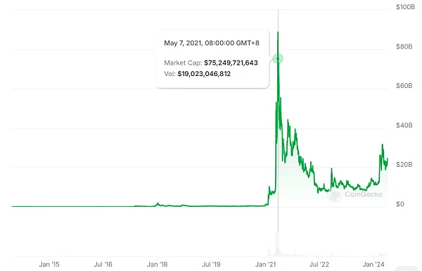 事实上,一开始狗狗币的出现只是用来讽刺比特币的炒作繁荣现状,但随着2021年狂暴大牛市的来袭,狗狗币的价值也在此时拉升到了顶峰——一枚狗狗币价值0.7316美元,狗狗币走红后,开始成为国外社交网络上流行的打赏小费,甚至马斯克也通过在愚人节宣布带狗狗币登上月球,以及参加节目时说自己是“狗狗币之父”等骚操作,不断给狗狗币炒作升温,带领狗狗币一跃飞天。