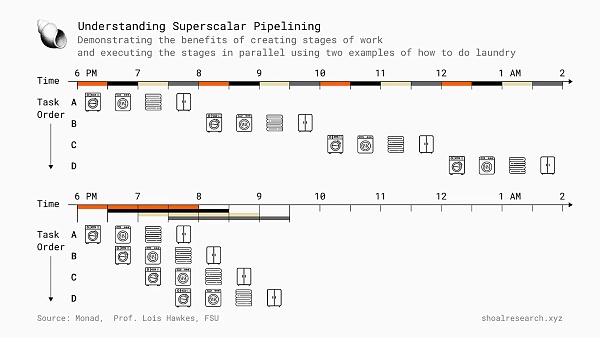 Monad 实现了并行执行和超标量流水线技术,以优化交易的速度和吞吐量。类似于 Sei v2,Monad 将采用乐观执行模型,这意味着网络将开始同时执行所有传入的交易,然后分析和验证交易以寻找冲突并相应地重新执行,最终目标是,如果交易按顺序执行,结果将是相同的。