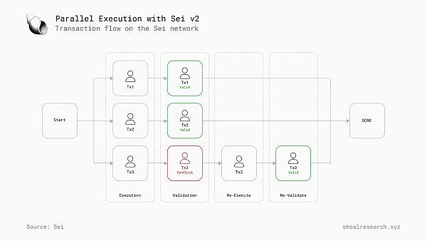 最初,Sei 采用了确定性并行执行模型,智能合约提前声明其所需的状态访问,以便系统能够同时运行不冲突的交易。随着他们 V2 升级的到来,Sei 正在过渡到一个乐观的并行模型,这意味着所有交易将在提交到网络时并行处理(执行阶段),然后在验证阶段检查与先前交易的冲突信息。如果发现两个或更多的冲突交易,即尝试访问相同网络状态的交易,Sei 会识别这一冲突点,然后根据冲突的性质,要么并行要么顺序地重新运行交易。