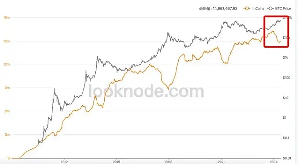 这个利好是不是会刺激风险市场大涨?BTC突破73,700的前高?这里先看下目前 BTC长期持有者的数据。如下图。(黑线是btc走势,橙线是btc长期持有者走势)