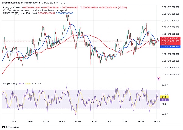 目前,PEPE 在其移动平均线附近波动,50 周期(蓝线)和 200 周期(红线)移动平均线紧密交织在一起,表明即将进入盘整阶段。相对强弱指数 (RSI) 为 54.29,相对中性,表明无论是上涨还是下跌,都缺乏强劲的动能。