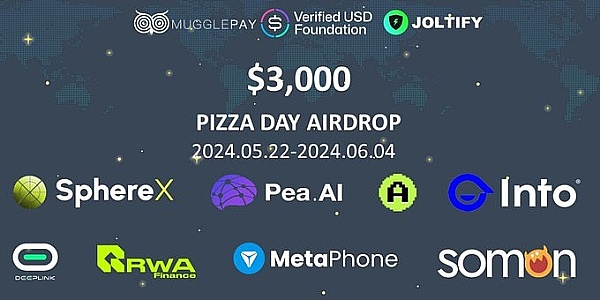 5月22日-6月2日,RWAS与10个项目等联合推出「比特币披萨节」,奖池达到3000美金。参与的项目包括MuggleLink、USDV、JOLTIFY、DeepLink、SphereX、Pea.AI、INTOverse、ArtsArena、MetaPhone、RWA Finance 和 SoMon等,共同倡导加密货币在日常交易中的无缝集成。