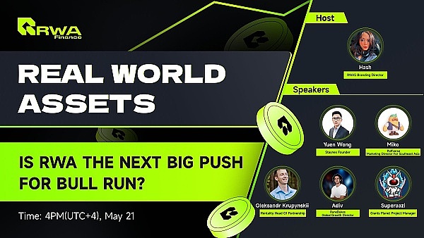 5月21日,《现实世界资产:RWA是牛市的下一个重大推动力吗》会议在RWA Finance推特直播进行。Staynex、Puffverse、Rentality、RuneDukes、Giants Planet等Web3机构嘉宾参与,吸引上万人在线围观。研究嘉宾就牛市推力展开了分析,并一致认为RWA赛道潜力释放正加速到来,RWA为传统金融资产提供了流动性,并丰富了DeFi代币种类,RWA还具有彻底改变金融、投资和区块链世界的能力。