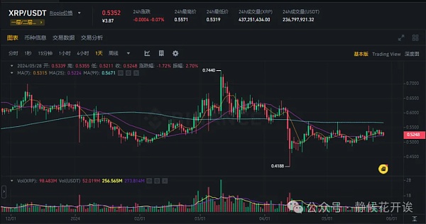 截至撰写本文时,XRP 代币的价格为 0.5248 美元,过去 24 小时内下跌了 0.62%。代币的图表显示其走势高度不稳定,交易时段既有红色区域,也有绿色区域。其 24 小时低点和高点分别为 0.5216 美元和 0.5399 美元。