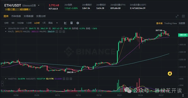 昨日BTC继续盘整,走势仍然保持健康,今日凌晨突破70000关口后未能站稳快速收回,今日再现利空,门头沟事件中的BTC开始转移,数量较大,市场有轻度恐慌,BTC应声下跌,关注事件后续发展情况,大方向未变,整体震荡上行,南力待发阶段,ETH利好落地后持续上涨,走势保持健康,继续冲击4000大关,上方阻力较大,仍需盘整蓄力,ETF利好仍在,6月将会是ETH表演的一个月,山寨板块有轻度回调整理,关注主流行情,6月山寨板块将会全新跟进