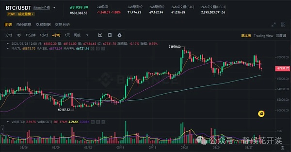 今日日内行情,BTC下方支撑67000-67500,上方阻力70500-71000,ETH3770-3980