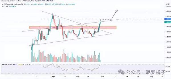 在突破决定性的对称三角形后,WIF 价格保持大幅上涨,涨幅超过 30%,已接近 4 美元,距离高点仅 12%。考虑到目前的市场趋势,多头似乎可能会牢牢控制住反弹,这可能有助于价格很快测试当前的最高价。