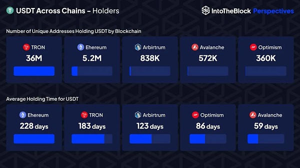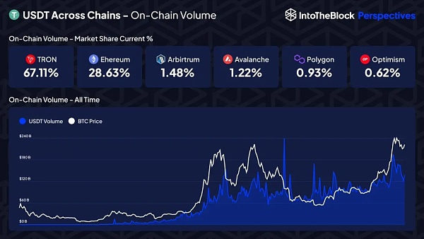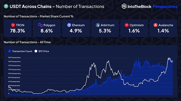 IntoTheBlock:USDT周交易笔数超1800万 波场TRON占比高达78.3%