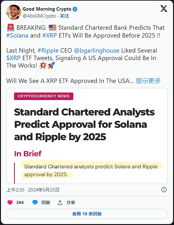 渣打银行分析师 Geoffrey Kendrick 表示,Solana 和 XRP ETF 可能很快成为加密货币领域的下一个大趋势。根据 Kendrick 的说法,这些代币有可能迎接市场的看涨势头,从而巩固其地位,确保 ETF 地位。