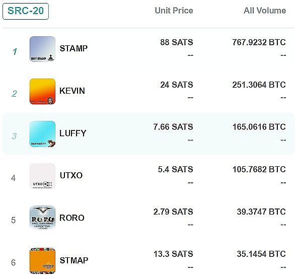 LUFFY:路飞币,目前最成功的 SRC-20 迷因币,当前市值约 800 BTC。