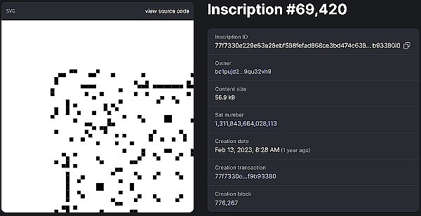 可以看到,这个铭文使用的 sat 是 1,311,843,664,028,113 号 sat,附带的信息中包含一张 svg 图像。