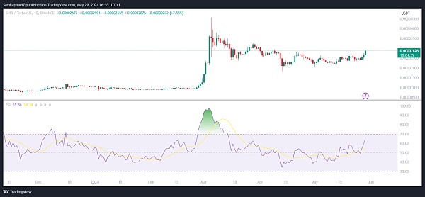 以目前 0.00002876 美元的价格计算,Shiba Inu 需要上涨 108% 才能达到 0.00006 美元,远低于 2 月底至 3 月初的 370% 涨幅。此外,尽管 SHIB 突然飙升,但其每日 RSI 仍为 65.97,远低于 70。这表明 Shiba Inu 仍有更大的价格增长空间。