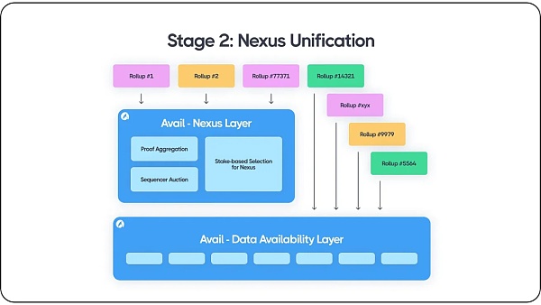 该模型的工作原理类似于 Avail 的 Nexus 互操作性层,其中包括证明聚合和排序拍卖机制,从而使其 DA 产品更加强大。与 Polygon 的 AggLayer 一样,与 Avail 集成的每条链或 Rollup 都可以在 Avail 现有的生态系统内进行互操作。此外,Avail 池化了来自各种区块链平台和 Rollup 的有序交易数据,包括以太坊、所有以太坊 Rollup、Cosmos 链、Avail Rollup、Celestia Rollup 以及不同的混合结构,如 Validiums、Optimiums 和 Polkadot 平行链等。来自任何生态系统的开发人员都可以在使用 Avail Nexus 的同时在 Avail 的 DA 层之上进行无需许可的构建,Avail Nexus 可用于跨生态系统的证明聚合和消息传递。