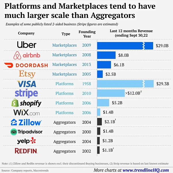 从历史上看,在非加密货币市场中,聚合器的市场份额小于平台: