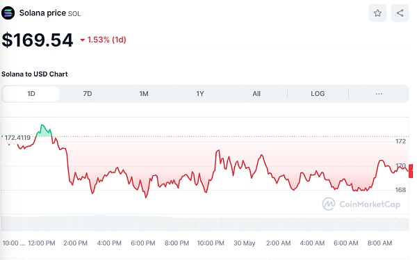 在此期间,在加密货币社区中,关于下一个可能推出的 SOL ETF 的讨论浮出水面,Solana的价格在过去 24 小时内下跌了 1.53%,达到 169.54 美元。其 24 小时最低价和最高价分别为 167.32 美元和 173.64 美元。