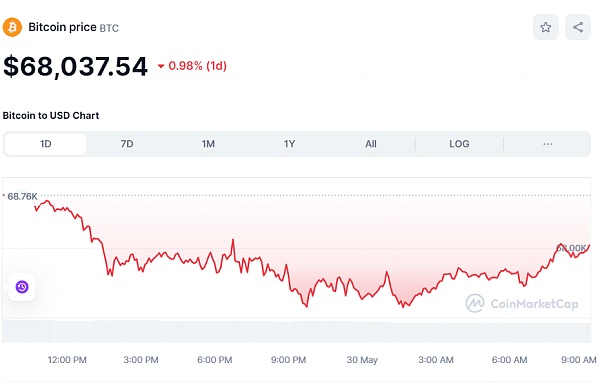 旗舰加密货币 BTC 今日交易时段主要呈现下跌趋势。BTC价格收于 68,037.54 美元,较昨日下跌 0.98%。其 24 小时低点和高点分别为 67,101.49 美元和 68,852.23 美元。