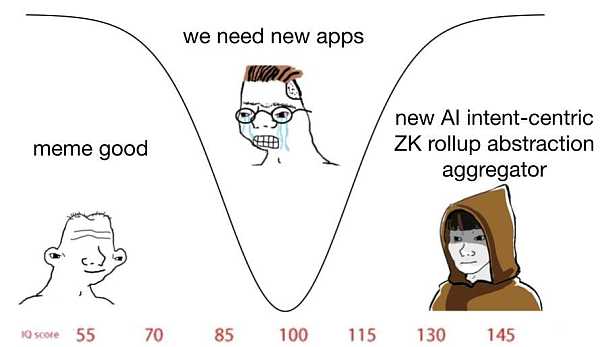 目前,行业陷入了两个极端:一方面是对没有内在价值的 meme 的乌托邦式拥抱,另一方面是乌托邦式的技术承诺无法解决当前的棘手问题。没有人专注于回答难题(用例)。如图所示,这就是熵减的真实写照: