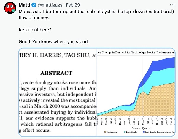 不管你怎么想,我们都还没有准备好或有资格吸收数万亿的机构资金流入。如果这些资金是通过 ETF 来实现的,那么最终的 degen 大佬们将进入始于 2020 年的宏观周期的最后一段。