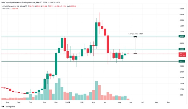 技术分析证实了这些观察结果,表明AVAX 目前正在 31.32 美元至 39.89 美元之间盘整。如果突破这一区间,价格可能会上涨 32%,达到下一个重要阻力位 48.85 美元左右。