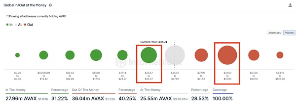 此外,灰色气泡标出了 36.77 美元左右的关键供应区,其中 541,000个地址已获得约 2555 万 AVAX。该区域也可能成为阻力位,可能限制价格上涨。