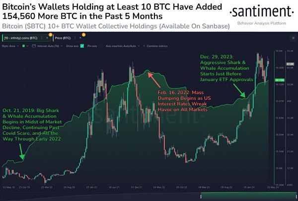 Santiment 的链上分析进一步证实了这一趋势,显示持有至少 10 BTC 的比特币钱包在过去五个月中增加了 154,560 BTC 的持仓量。大额钱包持有者的这种增持模式是市场情绪的关键指标,通常与看涨阶段有关。