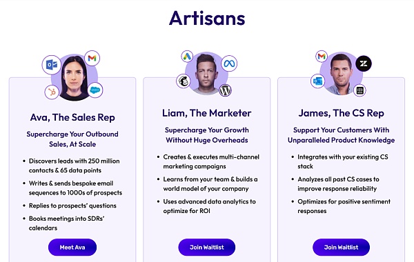 为了实现这一使命,Artisan AI开发出了一系列基于人工智能技术的数字员工,包括Ava(AI BDR)、Liam(市场营销人员)和James(客户支持代表)。这些AI员工具备高度智能和自主学习能力,能够独立完成各种工作任务,如销售、营销、客服等。