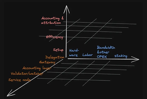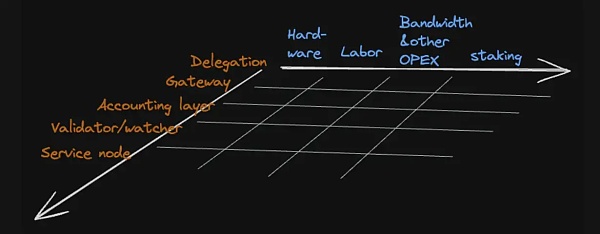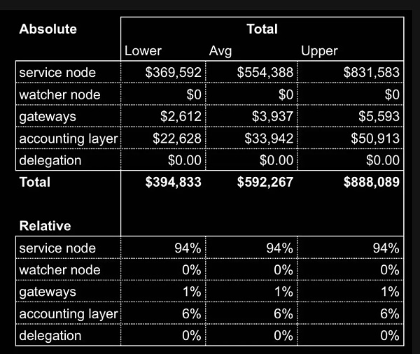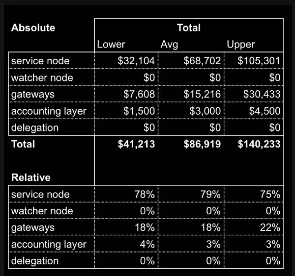 将所有这些要素综合起来,以创建成本估算是一项具有挑战性的任务。我们不仅需要为网络中的每个角色的每个成本组成部分提出估算,就像下图中所示那样,我们还需要考虑到并非所有节点运营商具有相同的成本结构。确定总体成本估算比简单地将所有网络节点运营商的数量乘以一个节点运营商的估算更为复杂。