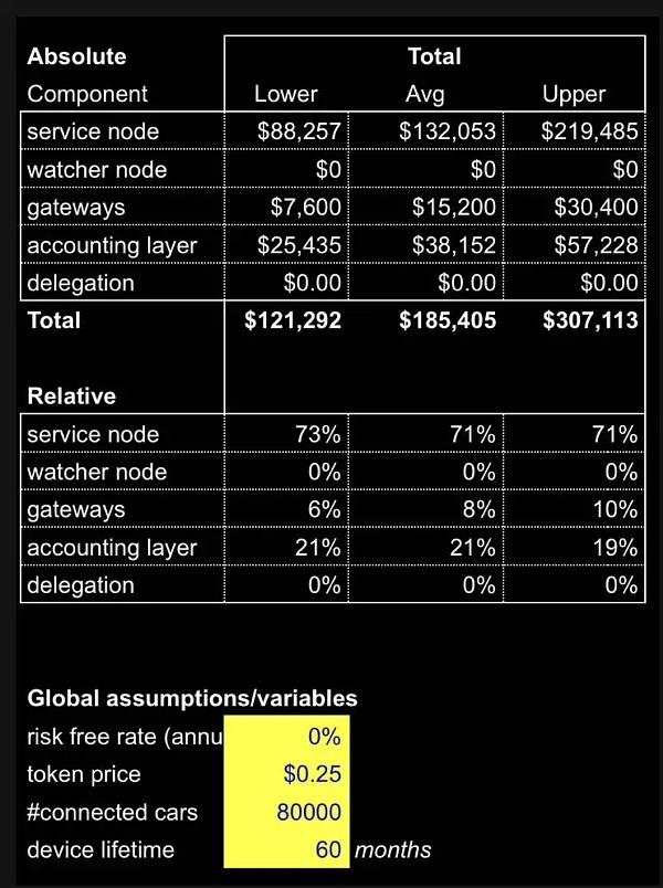 对于结算层,我们假设 Q1 2024 平均每辆连接汽车花费的 0.6 美元至 1.5 美元的一半可归因于 DIMO 的运营。对于网关,我们假设每月硬件成本约为 4,000 美元,与上述运营相关的劳动成本约为每月 11,000 美元。总的来说,这加起来约为每月 18 万美元的支出,如下表所示。大部分成本与带宽和其他成本相关,其中约 1/3 与 Polygon 上的结算成本有关,另外 2/3 与智能汽车集成的月度成本份额有关。