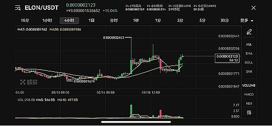 过去一个月ELON的价格走势表明meme的牛市仍在继续。该代币自 2024年5月11 日开始以 0.0000001674美元的低位开始交易以来一直处于强劲的上升趋势中。从那以后,ELON代币的价格一直在上涨,最近的交易价格为 0.0000002116美元。随着以太坊今夜的大涨,Elon今夜也涨了15个点,基本可以跟随ETH的脚步。随着价格越来越高,价格稳步突破阻力位。