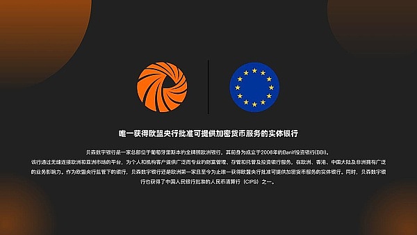 贝森数字银行是一家总部位于葡萄牙里斯本的全牌照欧洲银行,其前身为成立于2006年的Banif投资银行(BBI)。该行通过无缝连接欧洲和亚洲市场的平台,为个人和机构客户提供广泛而专业的财富管理、存管和托管及投资银行服务,在欧洲、香港、中国大陆及非洲拥有广泛的业务影响力。作为欧盟央行监管下的银行,贝森数字银行还是欧洲第一家且至今为止唯一获得欧盟央行批准可提供加密货币服务的实体银行。同时,贝森数字银行也获得了中国人民银行批准的人民币清算行(CIPS)之一。