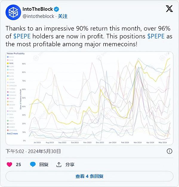 尽管存在这些波动,Pepe 仍然是主要 meme 币中利润最高的,目前超过 96% 的持有者都处于盈利状态。