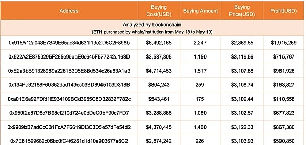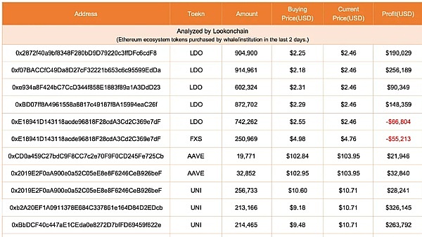 不过,巨鲸购买的币种并没有全数获利。根据Lookonchain 整理的表格,截至5 月25 日,部分$LDO、$FXS 与$ENS 持仓应购买价位较高而浮亏,但大部分持仓仍是浮盈,总计浮盈约110 万美元(约3,560万美元)。