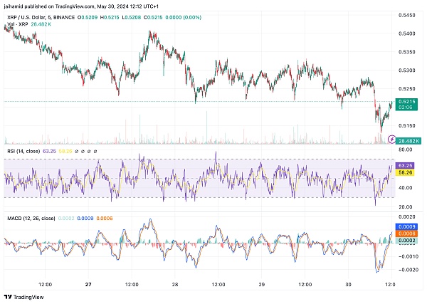 XRP/USD 图表反映出盘整模式的结束,表明买家(多头)和卖家(空头)之间正在进行拉锯战。RSI 一直在 60 左右徘徊,表明略有看涨势头,但未达到超买状态。
