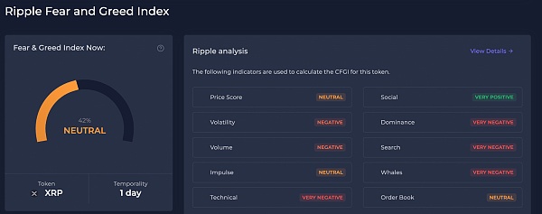 XRP 的Ripple 恐惧与贪婪指数目前为 42%,表明市场情绪中性。
