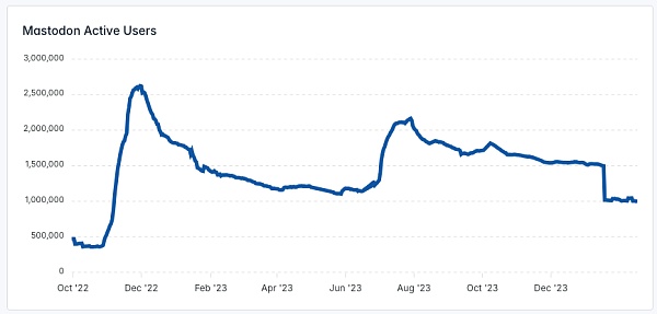 在 Web3 的 DeSo 兴起之前,Mastodon 是少数尝试去中心化社交的平台之一。尽管在埃隆・马斯克收购 Twitter 后曾短暂受益,但由于可用性和用户体验的碎片化问题,Mastodon 的增长最终停滞,日活跃用户数仅有 100 万。