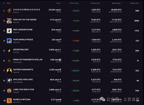 Magic Eden数据显示,过去24 小时内,市值排名前十的符文大多有双位数涨幅,以下摘要焦点符文: