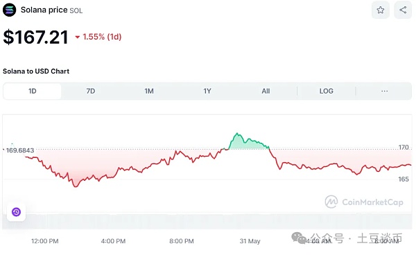 而Solana 的价格在过去 24 小时内也下跌了 1.55%,达到 167.21 美元。SOL 的 24 小时最低价和最高价分别为 163.68 美元和 172.42 美元。