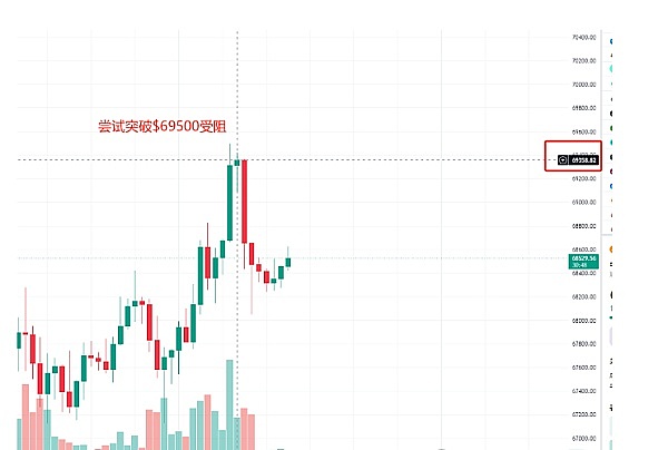 兄弟们早,昨晚BTC试图突破$69500受阻,