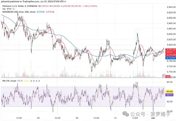 过去几天,ETH 的价格表现出韧性,尽管出现一些回撤,但总体上仍保持上升趋势。移动平均线 (MA) 线,包括 MA50(红色)和 MA200(蓝色),表明短期 MA50 偶尔会升至 MA200 上方,这表明潜在的看涨交叉点表明与长期趋势相比,短期势头有所增强。