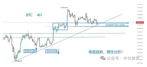 BTC在给的<趋势线>位置获得了支撑,盘面最低66670也是完美回踩支撑区间下轨。接下来的走势无非是直接涨的问题,还是浅跌一下再突破前高的问题,BTC短线机会不明显,这一块可以用山寨做替补,多头趋势下,中长线的筹码可以买入或持仓,近几天变盘向上是大概率的。有回踩的话,逢低干进去就完了,持币待涨!